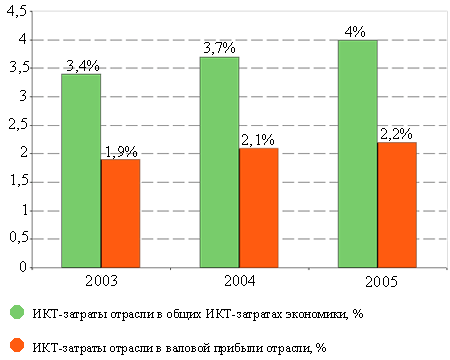 С 2003 по 2005 гг. доля ИКТ-затрат на транспорте (включая затраты на связь) выросла с 3,4;% до 4%. И, несмотря на относительно низкую рентабельность даже наиболее успешных предприятий, доля ИКТ-затрат возрастает (хоть и довольно медленно) и в валовой прибыли отрасли — с 1,9% в 2003 году до 2,2% в 2005 году.