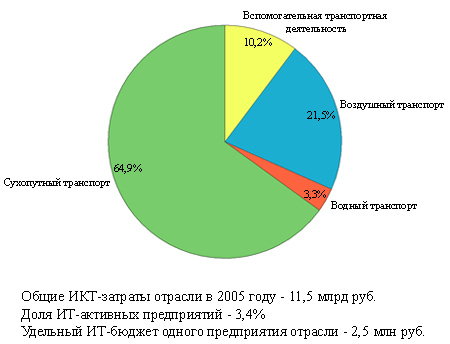 При этом ИТ-активными в 2005 году были не более 3-4% всех предприятий отрасли. С одной стороны, это означает, что удельный ИТ-бюджет одного ИТ-активного предприятия (при всей условности этого показателя) был достаточно высок и составил порядка 2,5 млн руб. Это, например, в четыре с лишним раза больше чем в благополучной торговле — т.е. "качество" информатизации отдельно взятого предприятия в транспортной отрасли выше. Но, с другой стороны, с учетом того, что в отличие от большинства отраслей транспорт — отрасль "инфраструктурная", информатизация отдельного предприятия здесь вещь довольно условная, имеющая смысл только в том случае, если уже информатизирована вся инфраструктура, которую отдельно взятое предприятие использует. В противном случае, высокие технологии будут давать эффект только для предприятий, не имеющих особого стратегического значения — например, служба такси или в лучшем случае грузовых портов и складов, которые действительно могут быть информатизированы отдельно от всего остального пространства и не особенно от этого страдать. Иное дело — воздушный флот или дальние грузовые морские перевозки.