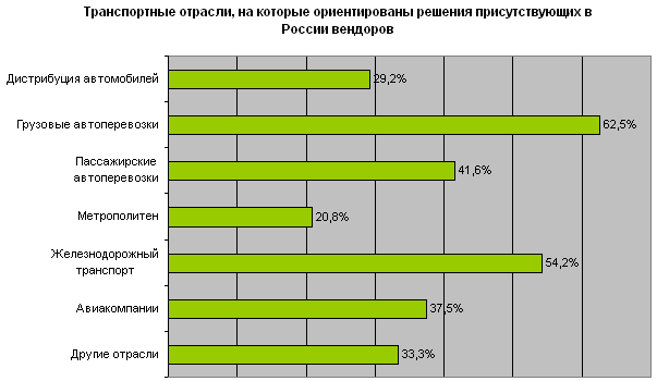 В компании «ИнтелЛекс» в целом согласны с мнением коллег: «Если говорить о ERP и CRM, то на российском транспортном рынке в большей степени распространены западные решения. А если рассматривать рынок систем управления перевозками — то здесь преобладают отечественные разработки». В «Ининг Бизнес Софт» отмечают, что для российских транспортников в большей степени применимы западные решения в области бюджетирования, а также системы GPS и CRM. В то же время среди клиентов «Ининг» есть несколько компаний, использующих решение систему SAP, однако для автоматизации транспортных подразделений там внедрена система «Ининг-Автопарк», интегрированная с решением SAP.