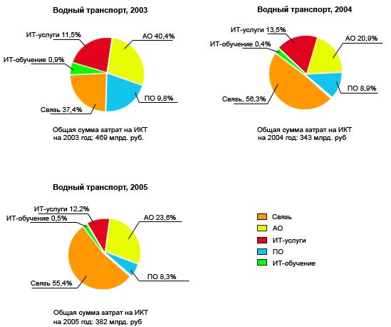 Низкий уровень ИТ-инвестиций на водном транспорте выглядит несколько странно — на фоне сравнительно высокой его рентабельности и не меньшей значимости для государства и бизнеса, чем прочего транспорта. Общий объем ИКТ-затрат на водном транспорте по итогам 2005 года составил около 380 млн руб., что в 6 раз ниже, чем на авиатранспорте и на порядок меньше чем в сухопутном транспорте. Но низкий объем ИТ-затрат ещё полбеды. Главной проблемой является неоправданное, идущее вразрез с требованиями времени, резкое снижение затрат на все виды ИТ, произошедшее за последние два года.